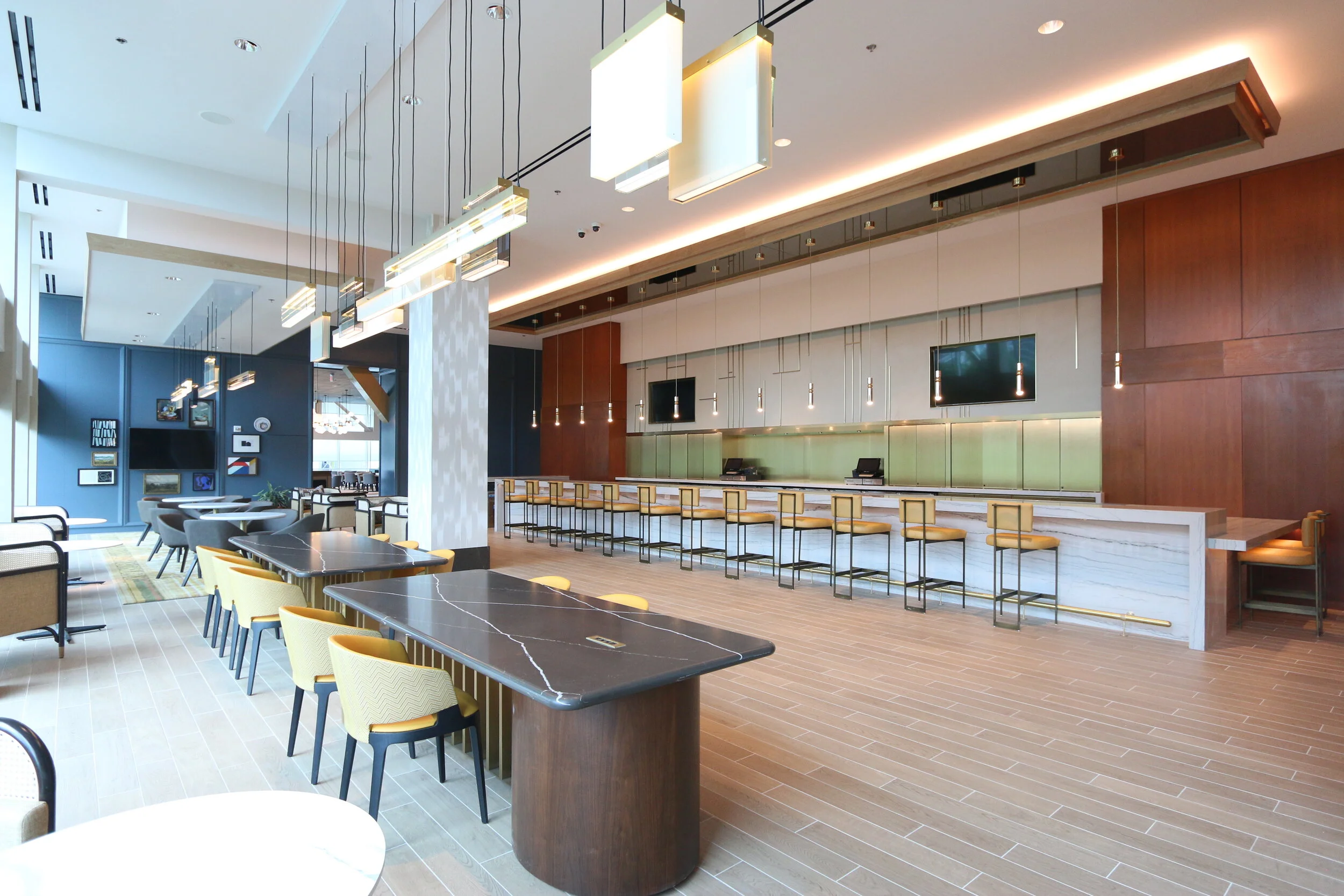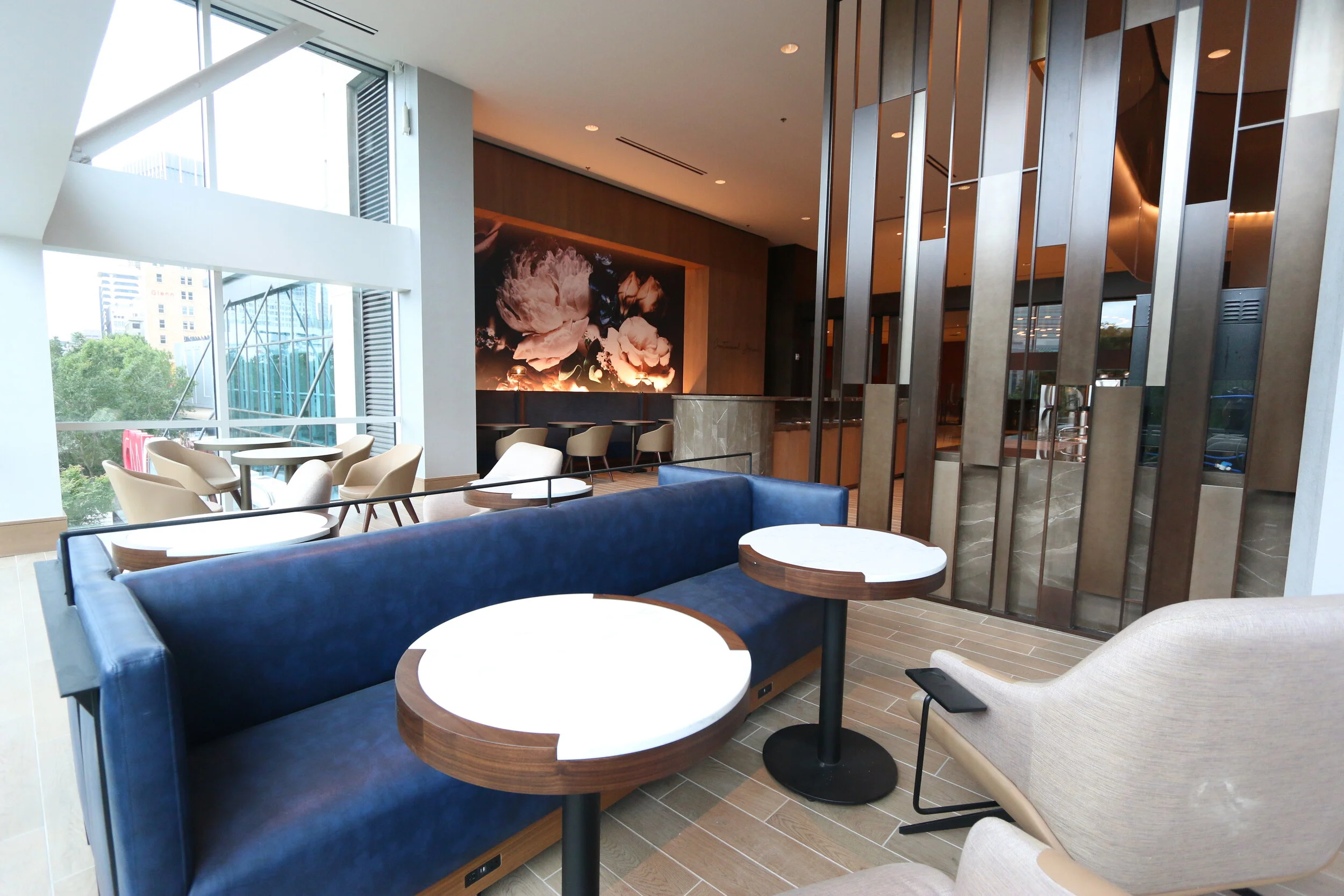 The transformative 40,000-square-foot renovation of the South Tower reimagined key public areas, including the motor court, lobbies, restrooms, offices, and dining spaces. The all-day dining area received updated finishes, while a stylish new living room bar offers an upscale yet comfortable gathering spot. A reimagined lobby seating area now features the Centennial Grounds coffee and retail shop, enhancing the guest experience. Existing office space was converted into Top Draught, a vibrant new sports bar with a full commercial kitchen and a signature polished red floor, offering the best view of Centennial Park from its elevated patio. Former retail areas were repurposed into modern office spaces and upgraded restrooms.